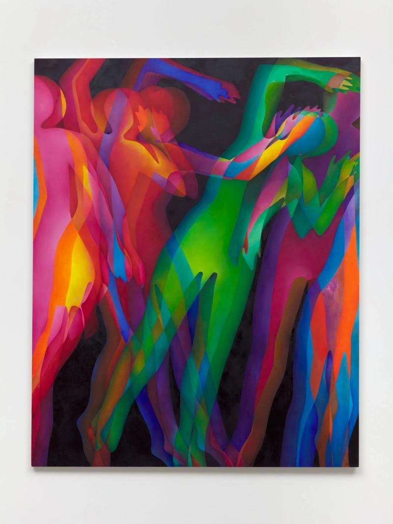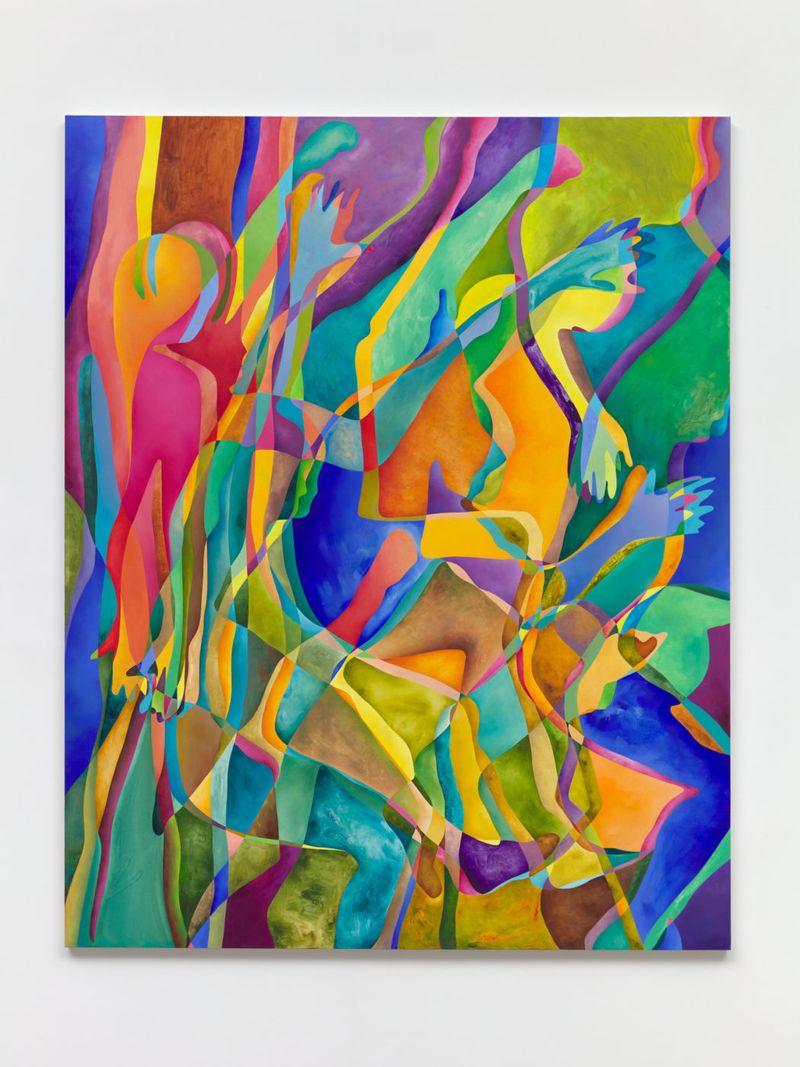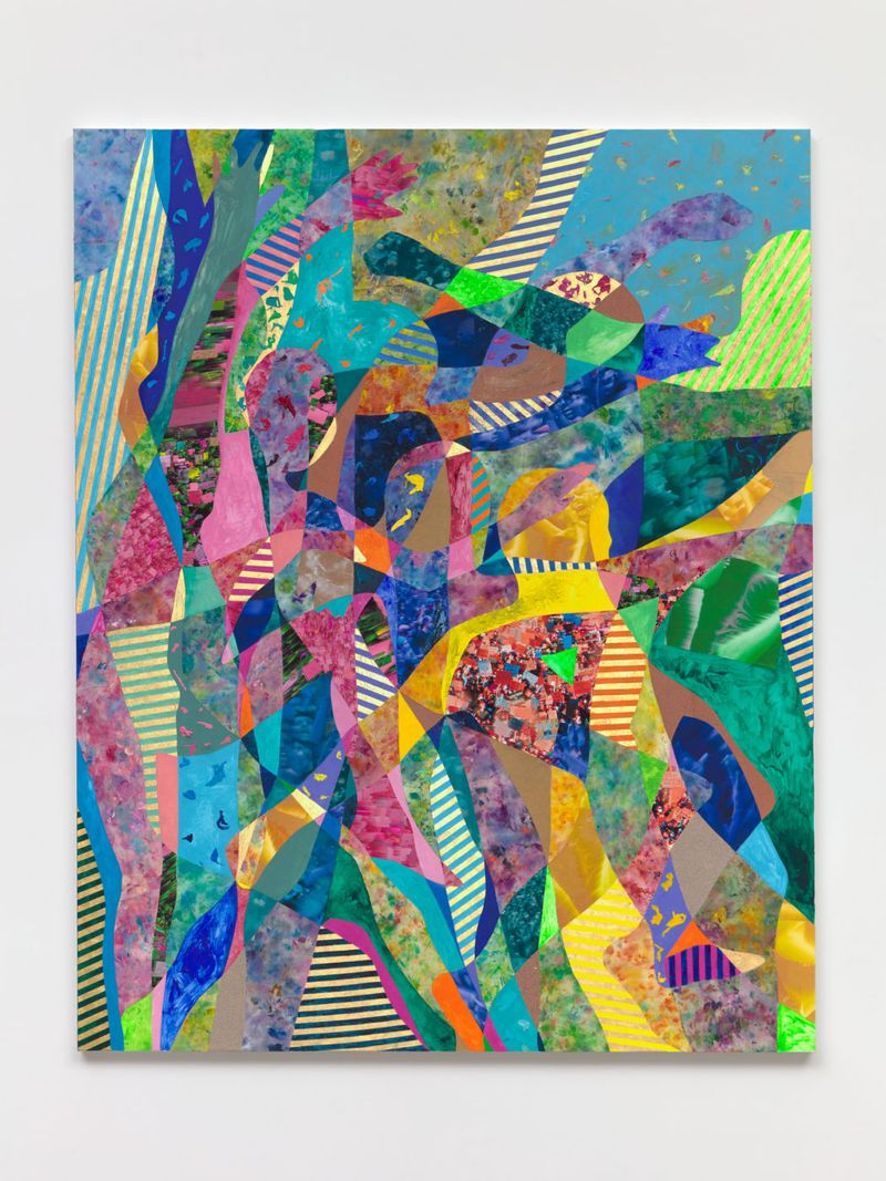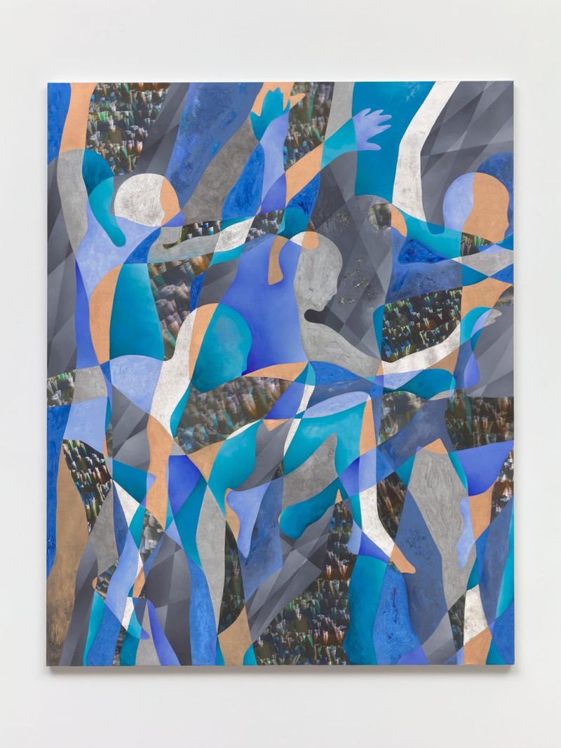 Bortolami is pleased to present Motions, an exhibition of new large paintings and collages by Anna Ostoya, our fifth exhibition with the artist. Derived from contours of the human body, the canvases show abstracted f igures in movement. These silhouettes overlap, duplicate, and repeat, creating an illusion of action — running, jumping, floating, fighting or falling. Some seem violent, others vulnerable or ecstatic. Ostoya uses various media for each work, including oil paint, newspapers, printed images of protests sourced from the internet, metallic leaf, and plastic shopping bags.