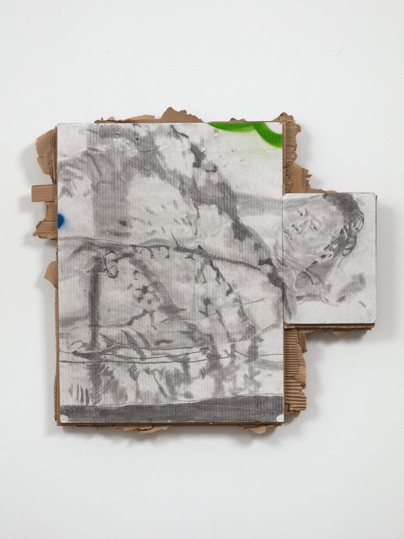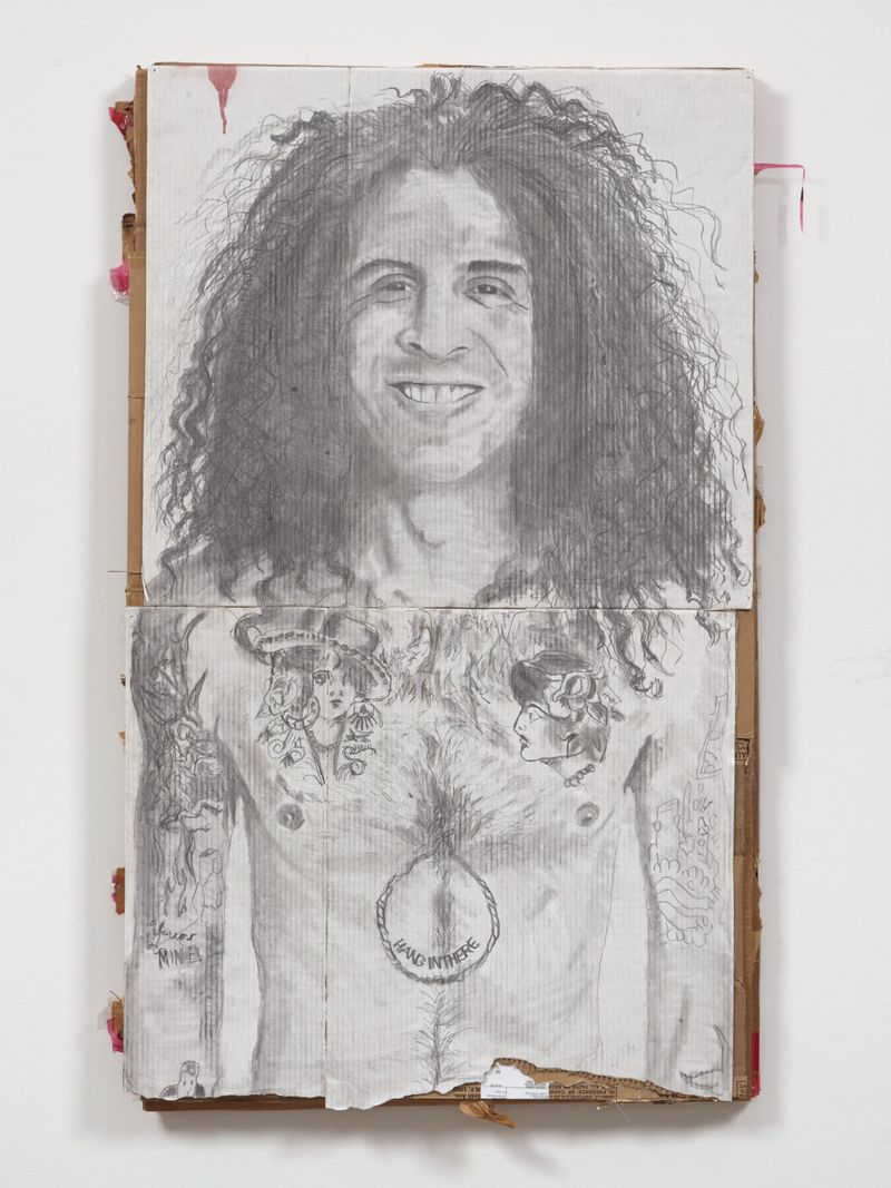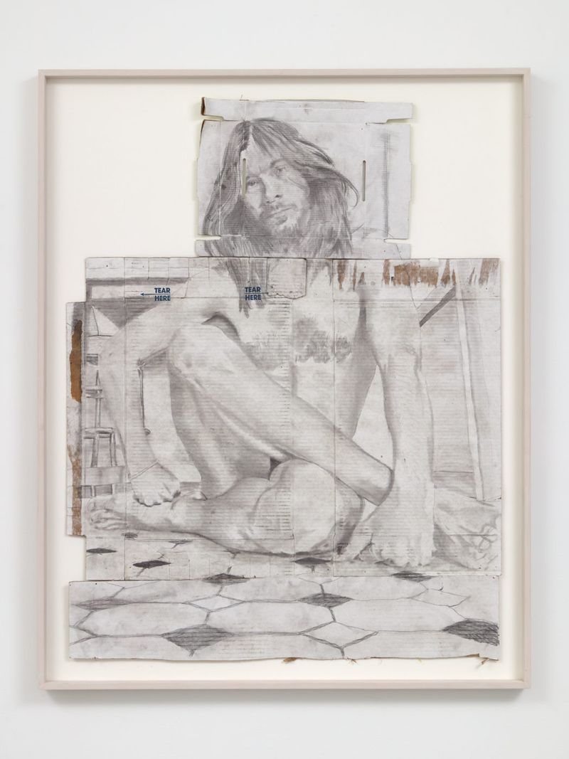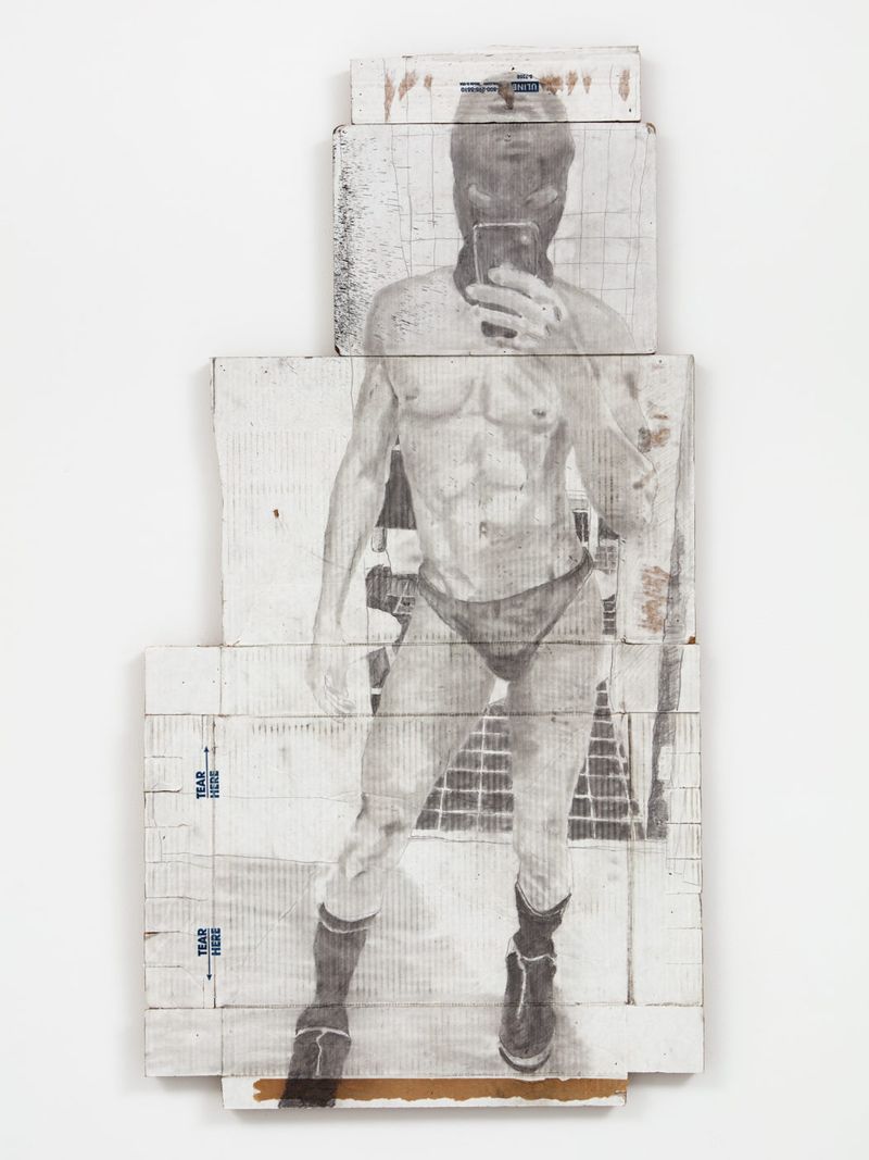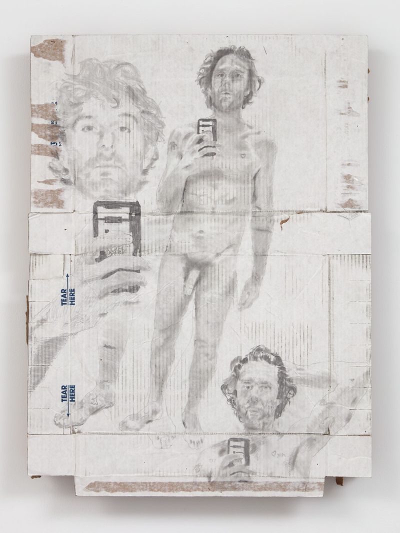 The history of portraiture is long and rich, and today, in the age of social media, the portrait has yet again transformed and become more ubiquitous than ever. Martins explores this perennial typology with the humblest of means: graphite and charcoal on white cardboard. As the title suggests, the artist requested naked selfies from his friends, and these suggestive self-portraits are the starting point for the works in this exhibition.