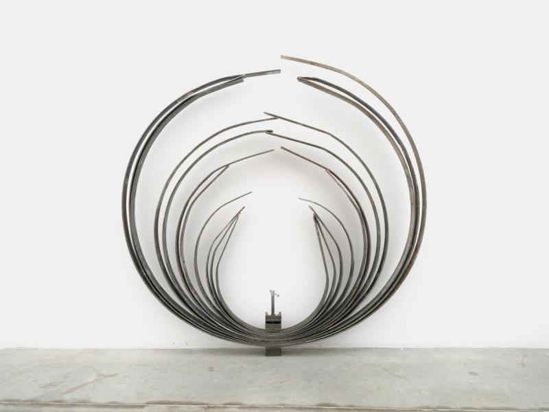 Four of the works are wall reliefs made from various metal components salvaged from a large-scale outdoor sign which was designed in the 1960s. The artist spent a year deconstructing each of the sign’s massive letters, bolt by bolt, into the parts which were repurposed for the works in this exhibition. With an abundance of material, Overton has utilized vestiges of the sign’s typeface, design, and previous fabrication techniques in tandem with her own sculptural interventions to abstract each material and form.
