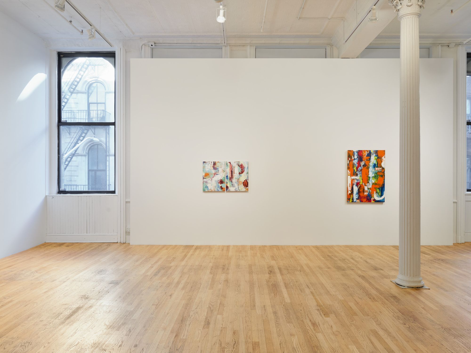 Vian Sora (b. 1976, Iraq; lives in Louisville, Kentucky) pits the precision of hard edged painting against an approach rooted in both chance and dissolution. Crisp, calligraphic shapes are overlaid upon soft, colorful grounds. Sora works flat, dispersing powdered pigments into aqueous painting mediums so that colors might “bloom” into one another.